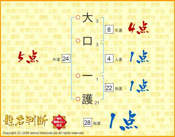 生活面を象徴する運勢です。外部から受ける影響力を表し、結婚運、家庭運や職場、環境への順応性を表します。総運から人運を引いた画数。姓や名が1文字の場合を除く。
