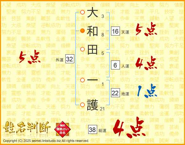 生活面を象徴する運勢です。外部から受ける影響力を表し、結婚運、家庭運や職場、環境への順応性を表します。総運から人運を引いた画数。姓や名が1文字の場合を除く。