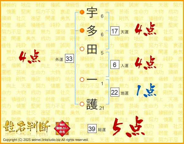 宇多田一護さんの外運は33画の4点!