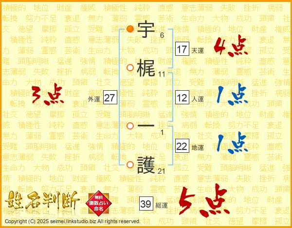 生活面を象徴する運勢です。外部から受ける影響力を表し、結婚運、家庭運や職場、環境への順応性を表します。総運から人運を引いた画数。姓や名が1文字の場合を除く。