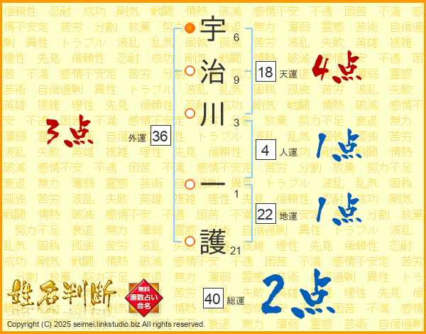 宇(6画)治(9画)川(3画) 一(1画)護(21画)