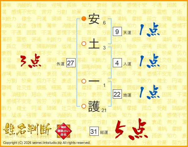 生活面を象徴する運勢です。外部から受ける影響力を表し、結婚運、家庭運や職場、環境への順応性を表します。総運から人運を引いた画数。姓や名が1文字の場合を除く。