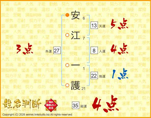 生活面を象徴する運勢です。外部から受ける影響力を表し、結婚運、家庭運や職場、環境への順応性を表します。総運から人運を引いた画数。姓や名が1文字の場合を除く。