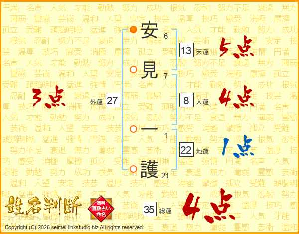 生活面を象徴する運勢です。外部から受ける影響力を表し、結婚運、家庭運や職場、環境への順応性を表します。総運から人運を引いた画数。姓や名が1文字の場合を除く。