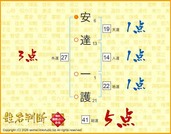 生活面を象徴する運勢です。外部から受ける影響力を表し、結婚運、家庭運や職場、環境への順応性を表します。総運から人運を引いた画数。姓や名が1文字の場合を除く。