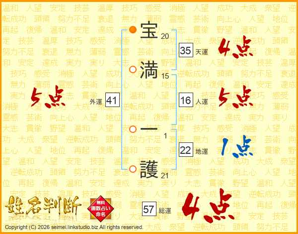 生活面を象徴する運勢です。外部から受ける影響力を表し、結婚運、家庭運や職場、環境への順応性を表します。総運から人運を引いた画数。姓や名が1文字の場合を除く。
