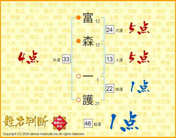 生活面を象徴する運勢です。外部から受ける影響力を表し、結婚運、家庭運や職場、環境への順応性を表します。総運から人運を引いた画数。姓や名が1文字の場合を除く。
