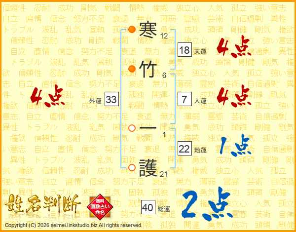 生活面を象徴する運勢です。外部から受ける影響力を表し、結婚運、家庭運や職場、環境への順応性を表します。総運から人運を引いた画数。姓や名が1文字の場合を除く。