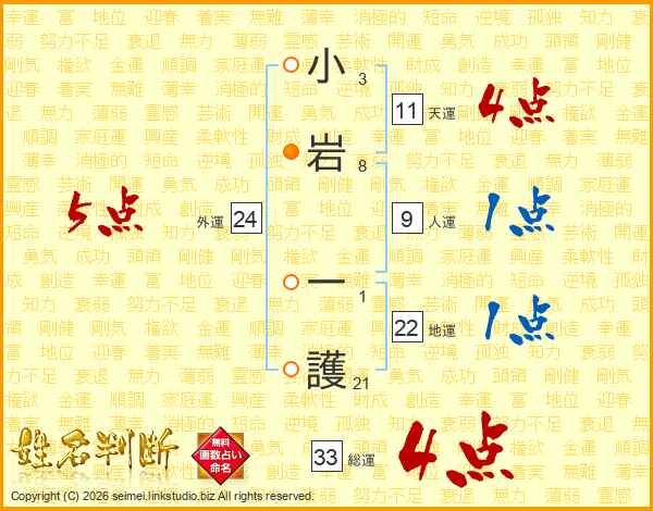 生活面を象徴する運勢です。外部から受ける影響力を表し、結婚運、家庭運や職場、環境への順応性を表します。総運から人運を引いた画数。姓や名が1文字の場合を除く。