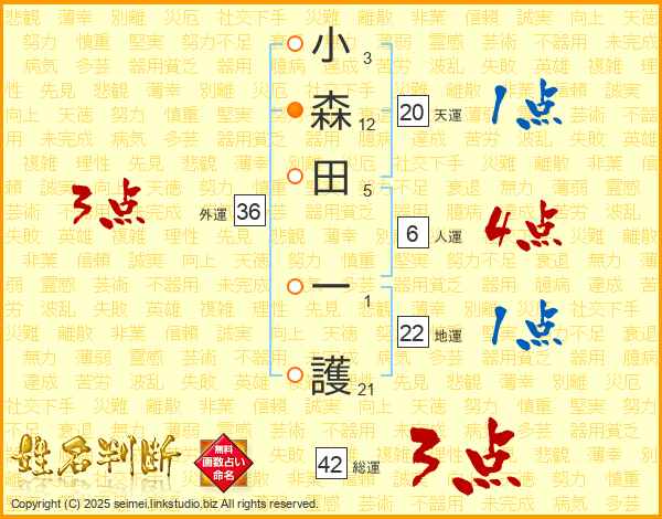 小(3画)森(12画)田(5画) 一(1画)護(21画)