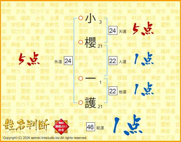 生活面を象徴する運勢です。外部から受ける影響力を表し、結婚運、家庭運や職場、環境への順応性を表します。総運から人運を引いた画数。姓や名が1文字の場合を除く。