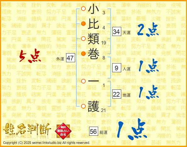 小(3画)比(4画)類(19画)巻(8画) 一(1画)護(21画)