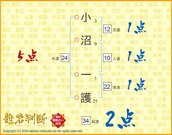 小沼一護さんの総運は34画の2点!
