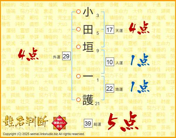小(3画)田(5画)垣(9画) 一(1画)護(21画)