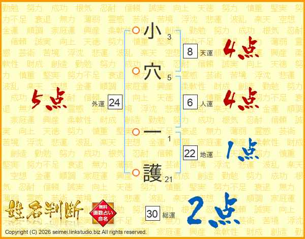 生活面を象徴する運勢です。外部から受ける影響力を表し、結婚運、家庭運や職場、環境への順応性を表します。総運から人運を引いた画数。姓や名が1文字の場合を除く。