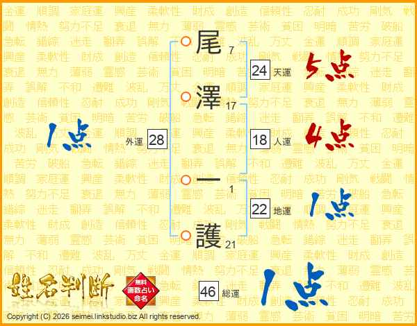 生活面を象徴する運勢です。外部から受ける影響力を表し、結婚運、家庭運や職場、環境への順応性を表します。総運から人運を引いた画数。姓や名が1文字の場合を除く。