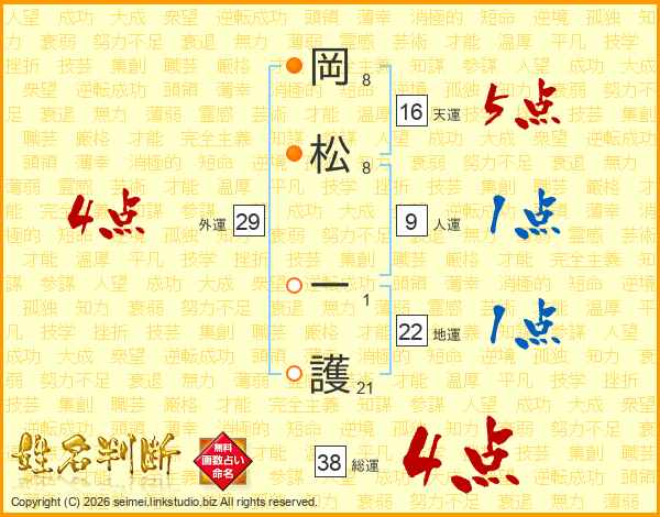 あなたの人生を表す1番重要な運勢です。生涯を通じて影響する総合運となり、主に50歳以降の晩年期に影響を及ぼします。苗字と名前の合計画数。