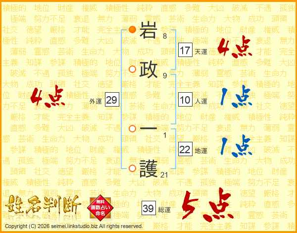 生活面を象徴する運勢です。外部から受ける影響力を表し、結婚運、家庭運や職場、環境への順応性を表します。総運から人運を引いた画数。姓や名が1文字の場合を除く。