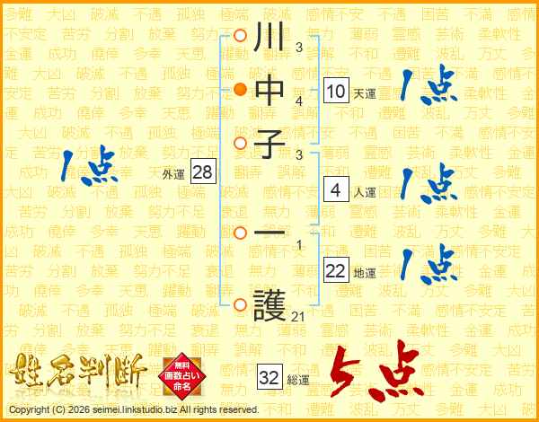 川中子一護さんの総運は32画の5点!