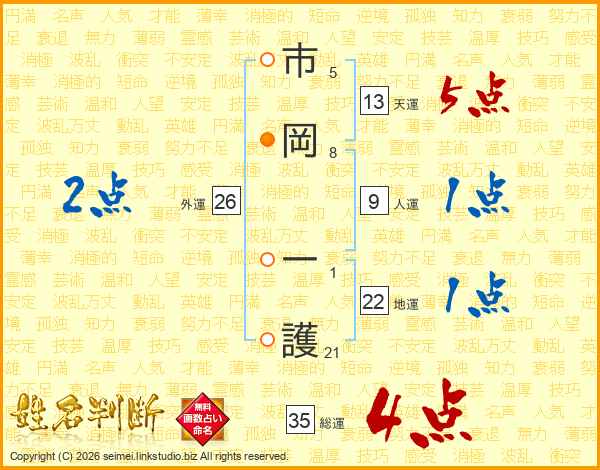 生活面を象徴する運勢です。外部から受ける影響力を表し、結婚運、家庭運や職場、環境への順応性を表します。総運から人運を引いた画数。姓や名が1文字の場合を除く。