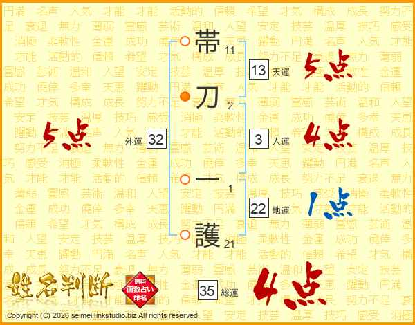 生活面を象徴する運勢です。外部から受ける影響力を表し、結婚運、家庭運や職場、環境への順応性を表します。総運から人運を引いた画数。姓や名が1文字の場合を除く。