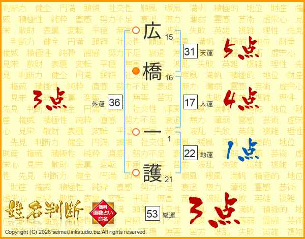 生活面を象徴する運勢です。外部から受ける影響力を表し、結婚運、家庭運や職場、環境への順応性を表します。総運から人運を引いた画数。姓や名が1文字の場合を除く。