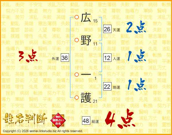 生活面を象徴する運勢です。外部から受ける影響力を表し、結婚運、家庭運や職場、環境への順応性を表します。総運から人運を引いた画数。姓や名が1文字の場合を除く。