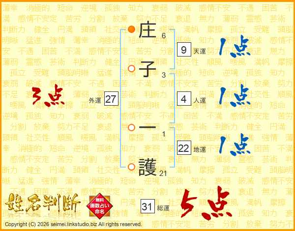 生活面を象徴する運勢です。外部から受ける影響力を表し、結婚運、家庭運や職場、環境への順応性を表します。総運から人運を引いた画数。姓や名が1文字の場合を除く。