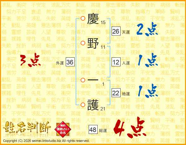 生活面を象徴する運勢です。外部から受ける影響力を表し、結婚運、家庭運や職場、環境への順応性を表します。総運から人運を引いた画数。姓や名が1文字の場合を除く。
