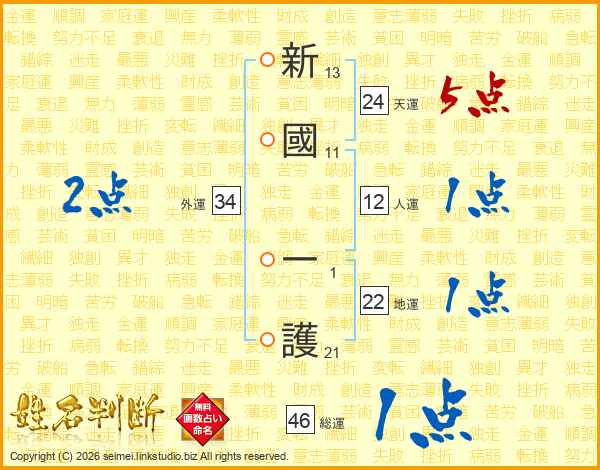 生活面を象徴する運勢です。外部から受ける影響力を表し、結婚運、家庭運や職場、環境への順応性を表します。総運から人運を引いた画数。姓や名が1文字の場合を除く。