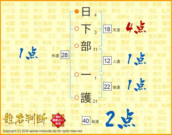日(4画)下(3画)部(11画) 一(1画)護(21画)