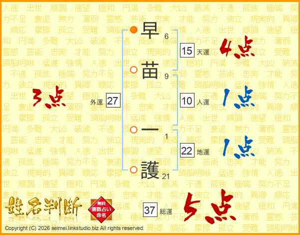 早苗一護さんの総運は37画の5点!
