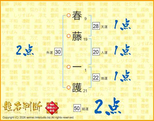 あなたの人生を表す1番重要な運勢です。生涯を通じて影響する総合運となり、主に50歳以降の晩年期に影響を及ぼします。苗字と名前の合計画数。