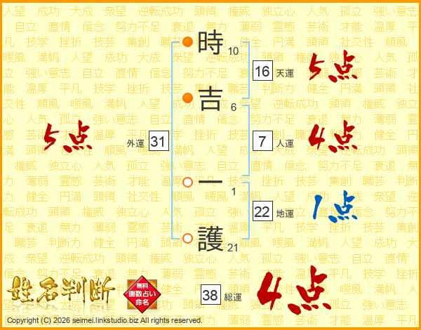 家系が持つ宿命的な運勢を表します。祖先から受け継いだ苗字ですので自分の力が及びません。家柄を象徴します。苗字の合計画数。