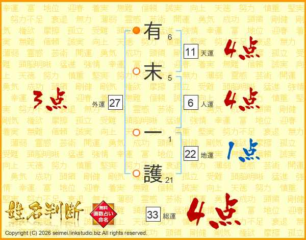 生活面を象徴する運勢です。外部から受ける影響力を表し、結婚運、家庭運や職場、環境への順応性を表します。総運から人運を引いた画数。姓や名が1文字の場合を除く。