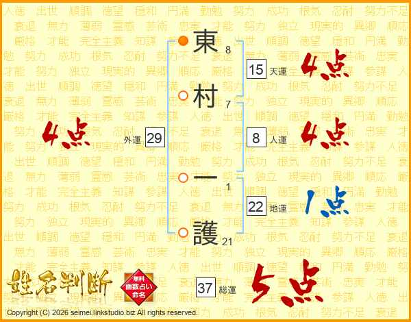 生活面を象徴する運勢です。外部から受ける影響力を表し、結婚運、家庭運や職場、環境への順応性を表します。総運から人運を引いた画数。姓や名が1文字の場合を除く。