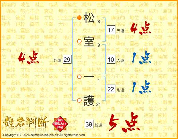 あなたの人生を表す1番重要な運勢です。生涯を通じて影響する総合運となり、主に50歳以降の晩年期に影響を及ぼします。苗字と名前の合計画数。
