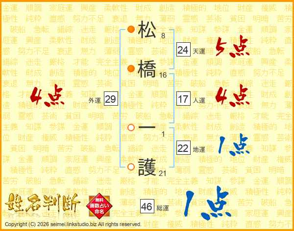あなたの人生を表す1番重要な運勢です。生涯を通じて影響する総合運となり、主に50歳以降の晩年期に影響を及ぼします。苗字と名前の合計画数。