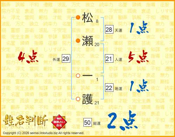 生活面を象徴する運勢です。外部から受ける影響力を表し、結婚運、家庭運や職場、環境への順応性を表します。総運から人運を引いた画数。姓や名が1文字の場合を除く。
