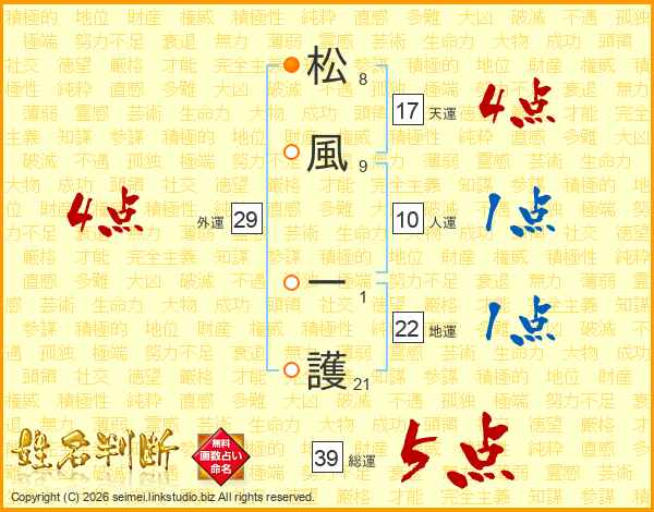 あなたの人生を表す1番重要な運勢です。生涯を通じて影響する総合運となり、主に50歳以降の晩年期に影響を及ぼします。苗字と名前の合計画数。