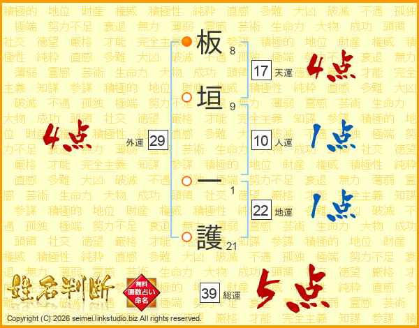 生活面を象徴する運勢です。外部から受ける影響力を表し、結婚運、家庭運や職場、環境への順応性を表します。総運から人運を引いた画数。姓や名が1文字の場合を除く。