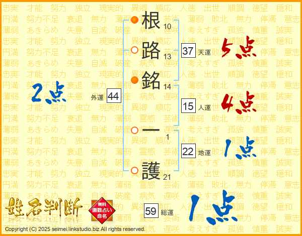 根(10画)路(13画)銘(14画) 一(1画)護(21画)