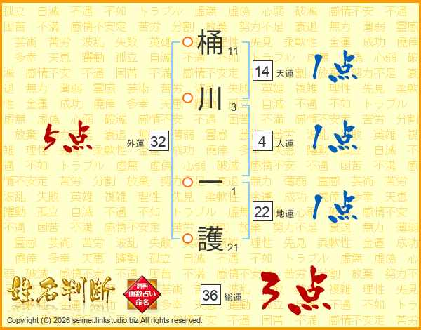 生活面を象徴する運勢です。外部から受ける影響力を表し、結婚運、家庭運や職場、環境への順応性を表します。総運から人運を引いた画数。姓や名が1文字の場合を除く。