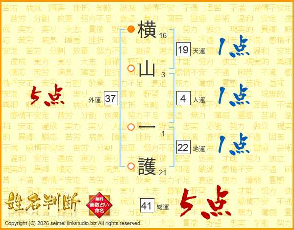 生活面を象徴する運勢です。外部から受ける影響力を表し、結婚運、家庭運や職場、環境への順応性を表します。総運から人運を引いた画数。姓や名が1文字の場合を除く。