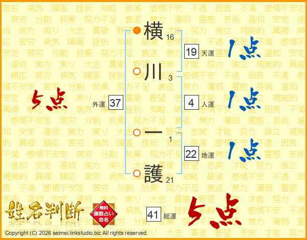 横川一護さんの総運は41画の5点!