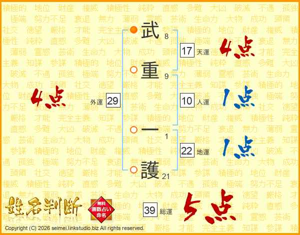 生活面を象徴する運勢です。外部から受ける影響力を表し、結婚運、家庭運や職場、環境への順応性を表します。総運から人運を引いた画数。姓や名が1文字の場合を除く。