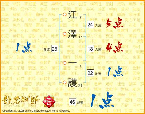 生活面を象徴する運勢です。外部から受ける影響力を表し、結婚運、家庭運や職場、環境への順応性を表します。総運から人運を引いた画数。姓や名が1文字の場合を除く。