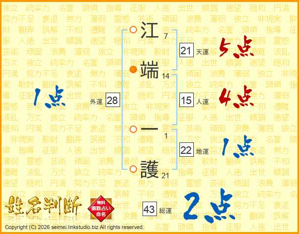生活面を象徴する運勢です。外部から受ける影響力を表し、結婚運、家庭運や職場、環境への順応性を表します。総運から人運を引いた画数。姓や名が1文字の場合を除く。