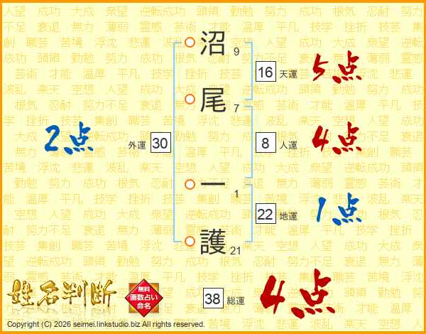 生活面を象徴する運勢です。外部から受ける影響力を表し、結婚運、家庭運や職場、環境への順応性を表します。総運から人運を引いた画数。姓や名が1文字の場合を除く。