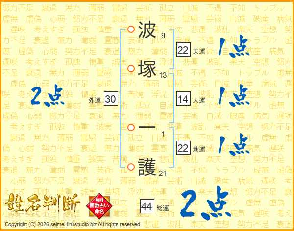 生活面を象徴する運勢です。外部から受ける影響力を表し、結婚運、家庭運や職場、環境への順応性を表します。総運から人運を引いた画数。姓や名が1文字の場合を除く。